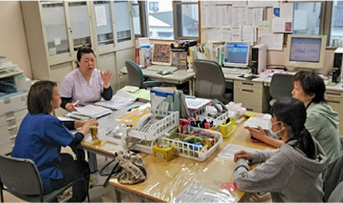 毎朝の打ち合わせ会議、月1回の職場会議にて、活動計画を練り、子育て世代でも安心して働ける職場づくりをめざしています。